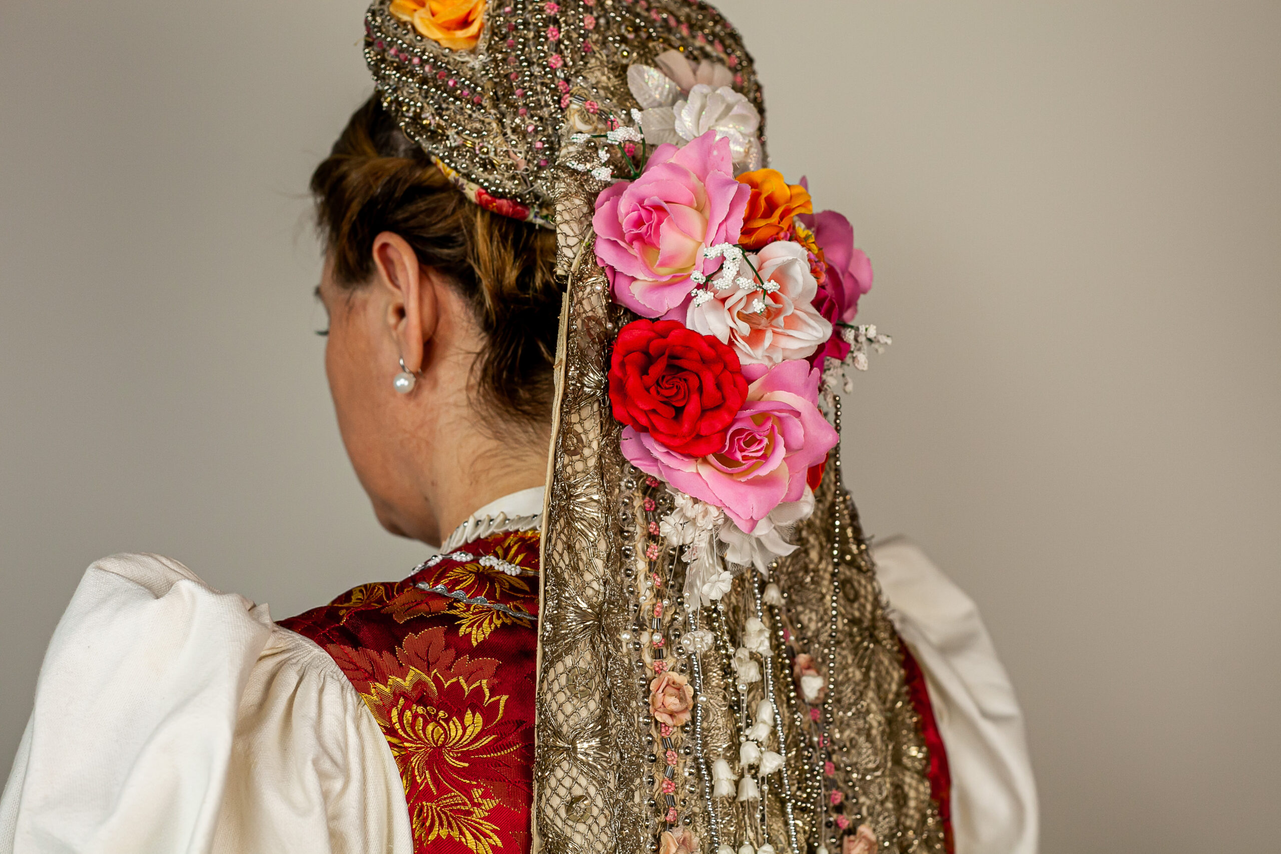 A fejviselet kemény vázát az úgynevezett kalap adta, mely ezüst vagy rézcsipkével, illetve fehér és rózsaszín gyöngyökkel díszített. Tetejét rózsaszín, fehér és narancsszínű művirág koszorú ékesíti. A másik fő alkotórész a lecsüngő. Ez szintén ezüst vagy rézcsipkével borított, rózsaszín és fehér gyöngyökkel díszített, alján ezüstrojt és flitter található.